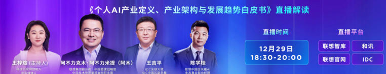 此外,联想还联合IDC率先发布《个人AI产业定义、产业架构与发展趋势白皮书》。在产业变革的大时代里,你可以在其中找到关于个人AI产业发展、大模型厂商的未来、智能体的个性化趋势等一些行业热点问题的答案,登录联想官网即可查看报告。